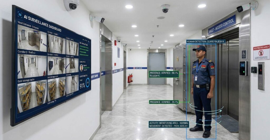 AI-powered surveillance provides continuous monitoring of vault environments, enabling early detection of suspicious activity or operational anomalies.